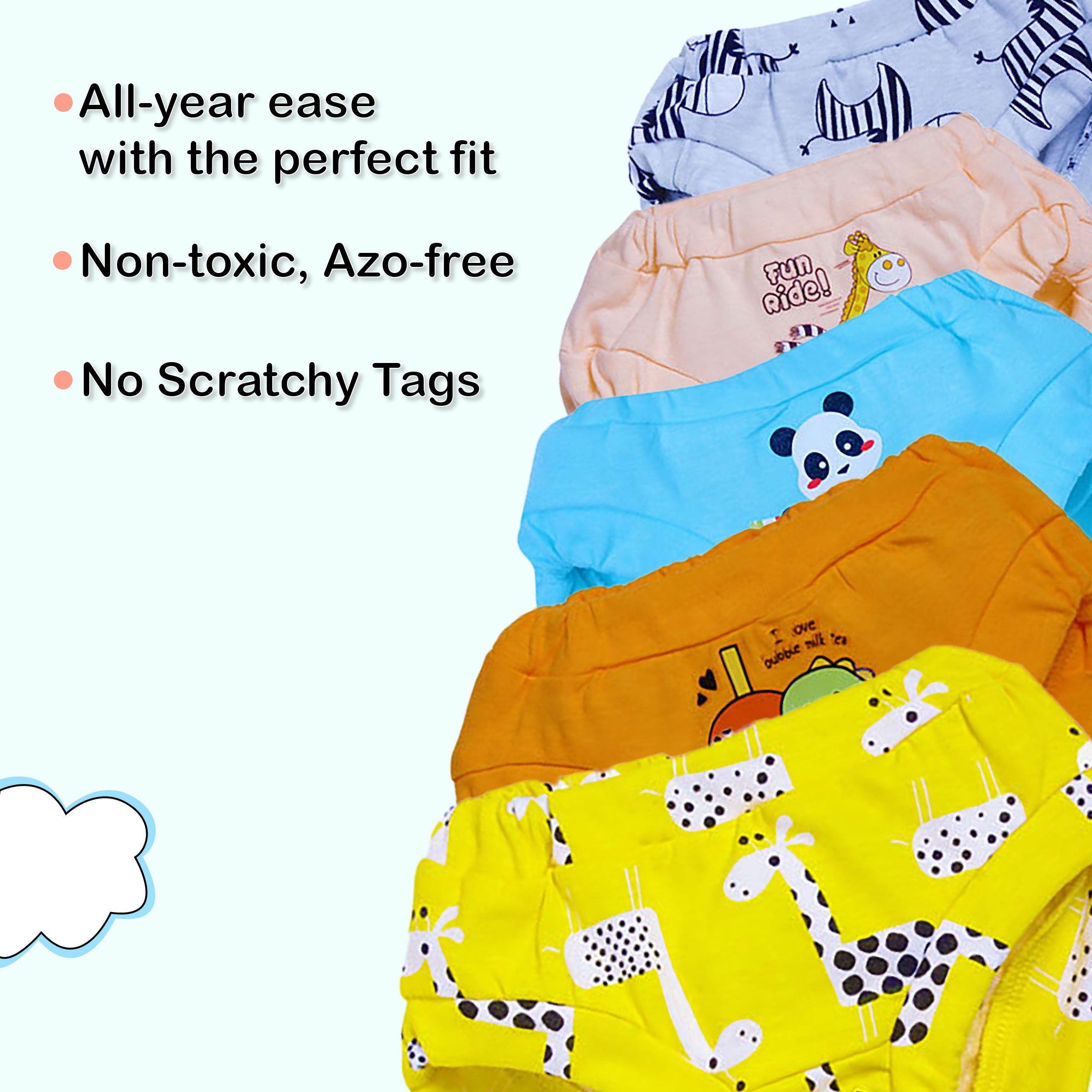 Say hello to Snugkins regular underwear / Briefs - Tiny Tushies, the hippest undies for kids! Crafted with the goodness of premium quality 100% pure cotton, they give your little ones the ultimate comfort experience. They're so soft, breathable, and stretchable, it's like wearing a cloud! But wait, there's more! No more pesky tags that scratch and irritate. Only soft seams and elastic, keeping skin irritation at bay