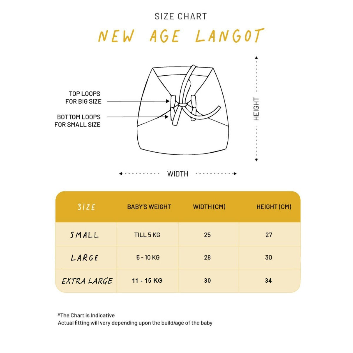 Since New Age Langot is specially made for babies up to 1-year old. It comes in three sizes: Size 1: newborn up to 5 kgs Size 2: Babies weighing 3kg - 7kg Size 3: Babies weighing 5kg-10kg.
